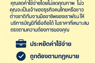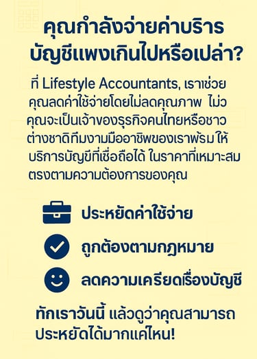 ที่ Lifestyle Accountants เราช่วยคุณลดค่าใช้จ่ายโดยไม่ลดคุณภาพ ไม่ว่าคุณจะเป็นเจ้าของธุรกิจคนไทยหรือชาวต่างชาติ ทีมงานมืออาชีพของเราพร้อมให้บริการบัญชีที่เชื่อถือได้ ในราคาที่เหมาะสม ตรงตามความต้องการของคุณ